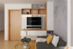 V prostoru zůstává sedačka IKEA FRIHETEN – plní svou roli perfektně a dokonale sedí ke zbytku interiéru. Kolem televize vzniká vzdušná sestava nástěnných skříněk, které nejen elegantně doplňují stěnu, ale zároveň nabízí praktické úložné místo. Skříňka pod TV se posouvá výš, aby šla snadno otevřít i ze sedačky. Pod ní zůstává volný prostor, kam bez problémů zapadnou taburety, robotický vysavač nebo třeba konferenční stolky při rozložení sedačky.
