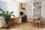 Pokoj bez kuchyně nabízí dostatek prostoru pro klid, soustředění i společné chvíle. Jídelní část získává své místo u velkého okna, kde denní světlo dopadá přímo na stůl a vytváří příjemnou atmosféru pro snídani, oběd i večeři. Stůl slouží nejen ke stolování, ale i ke společenskému životu – knihy, deskovky, povídání do večera. Čalouněné židle zajišťují pohodlí i při delším sezení a ladí s celkovým stylem interiéru.