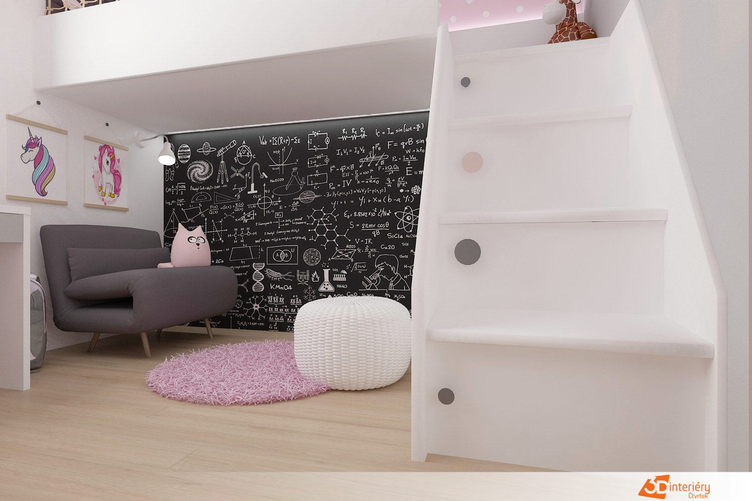 Dívčí pokojíček Ostrava – v klasických holčičích barvičkách jsem navrhovala pokoj pro mladou slečnu v Ostravě. Prostor pod patrem je pro návštěvy kamarádek – posezení ve dvou variantách – Multifunkční rozkládací křeslo DT083