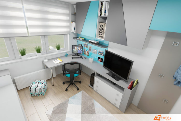 Návrh studentského pokoje pro kluka, nadšeného tenistu z Brna je v oblíbených klučičích barvách šedá a azurově modrá.