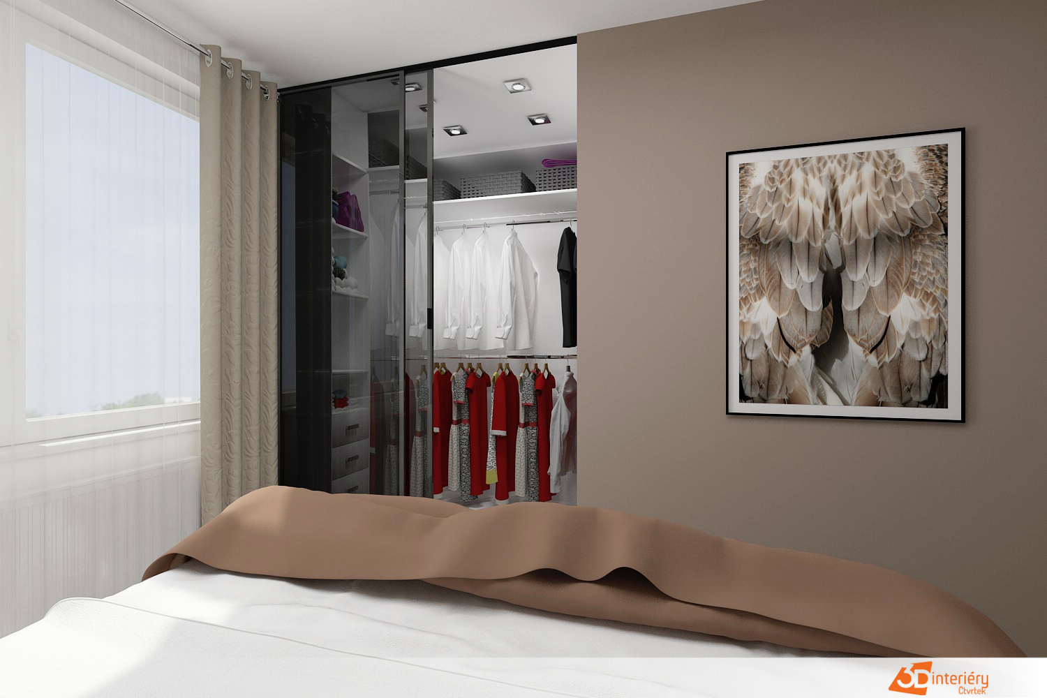 V místnosti se nacházel prostor, který jsme plnohodnotně využily šatnou. Stěna šatny je prosklená s posuvnými dveřmi – tmavé sklo působí luxusně. Přesto si zákazník přál i vestavěnou skříň, protože byt v dalších prostorách nenabízí dostatek možností pro úložné prostory.