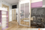 Dětský pokoj pro tři malé holčičky z Vysočiny – hlavním požadavkem na pokojíček bylo co nejvíce úložného prostoru pro holčičky. Zároveň neměl prostor pro slečny působil stísněně. Skříně, pro úsporu místa jsem zvolila s posuvnými dviřky, při otevření tudíž zbytečně nepřekáží a šetří místem v nevelkém pokoji.