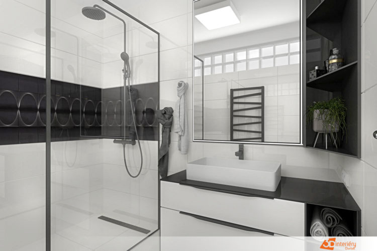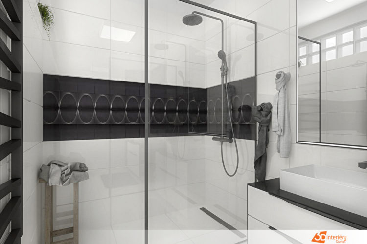První varianta – dominantou černý obklad ve sprše od firmy Los Kachlos – Zen Negro Mate. Tato kombinace barev nikdy nevyjde z módy, je nadčasová a minimalistická zároveň. Bílý lesklý obklad je doplněn černými doplňky, jako je baterie, topný žebřík a část nábytku, vzniká nám tak krásný kontrast mezi těmito barvami.