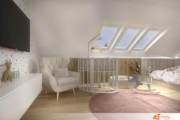 Tento interiér ladil interiér designér především pro miminko v béžové barvě doplněné růžovou. Útulnost nám v interiéru zajišťují dřevěné lamely na dvou stěnách.