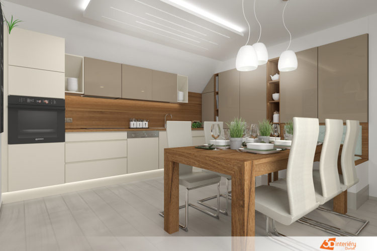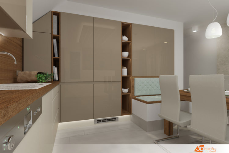 Zvolila jsem kombinaci dřeva a lesku, což interiéru dodalo ten správný ,,šmrnc,,. Co nejvíce jsem se snažila využít výklenky, které nefunkčně zasahovali do místnosti…jako např. schody do přízemí ze sousedící místnosti jsem využila jako lavici, která rozšíří počet sedících u stolu. Dalším oříškem byla šikmina u stropu. Tu jsem z větší části zakryla horními skříňkami, které musely být na míru, ale potřebný úložný prostor vyvážil o něco vyšší náročnost jejich výroby.