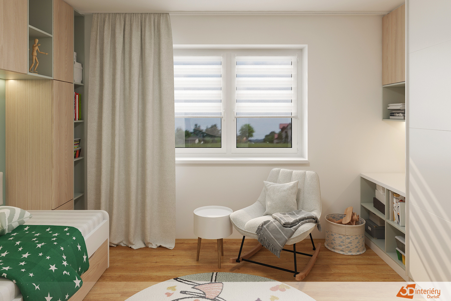 Interiér s dětskou tapetou do pokoje rodinného domu v Praze. Návrh zpracoval náš designér kolega z Prahy 8. Dětské tapety v interiéru našich dětí dokáží proměnit všední pokoj v říši fantazie, ve které se cítí bezpečně a sebejistě. Námi použité materiály vždy splňují ty nejpřísnější zdravotní normy.