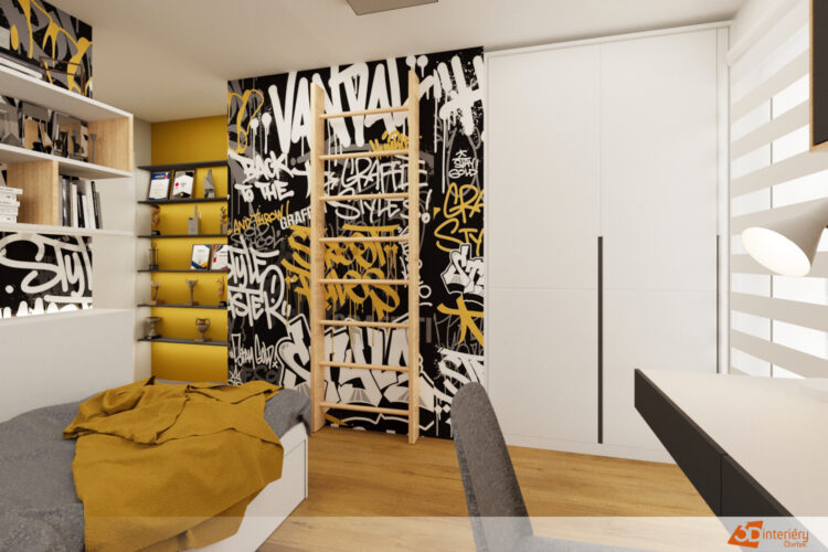 Přítomnost graffiti v pokoji vytváří nejen originální vzhled, ale i prostor, který podporuje kreativitu a osobní vyjádření.