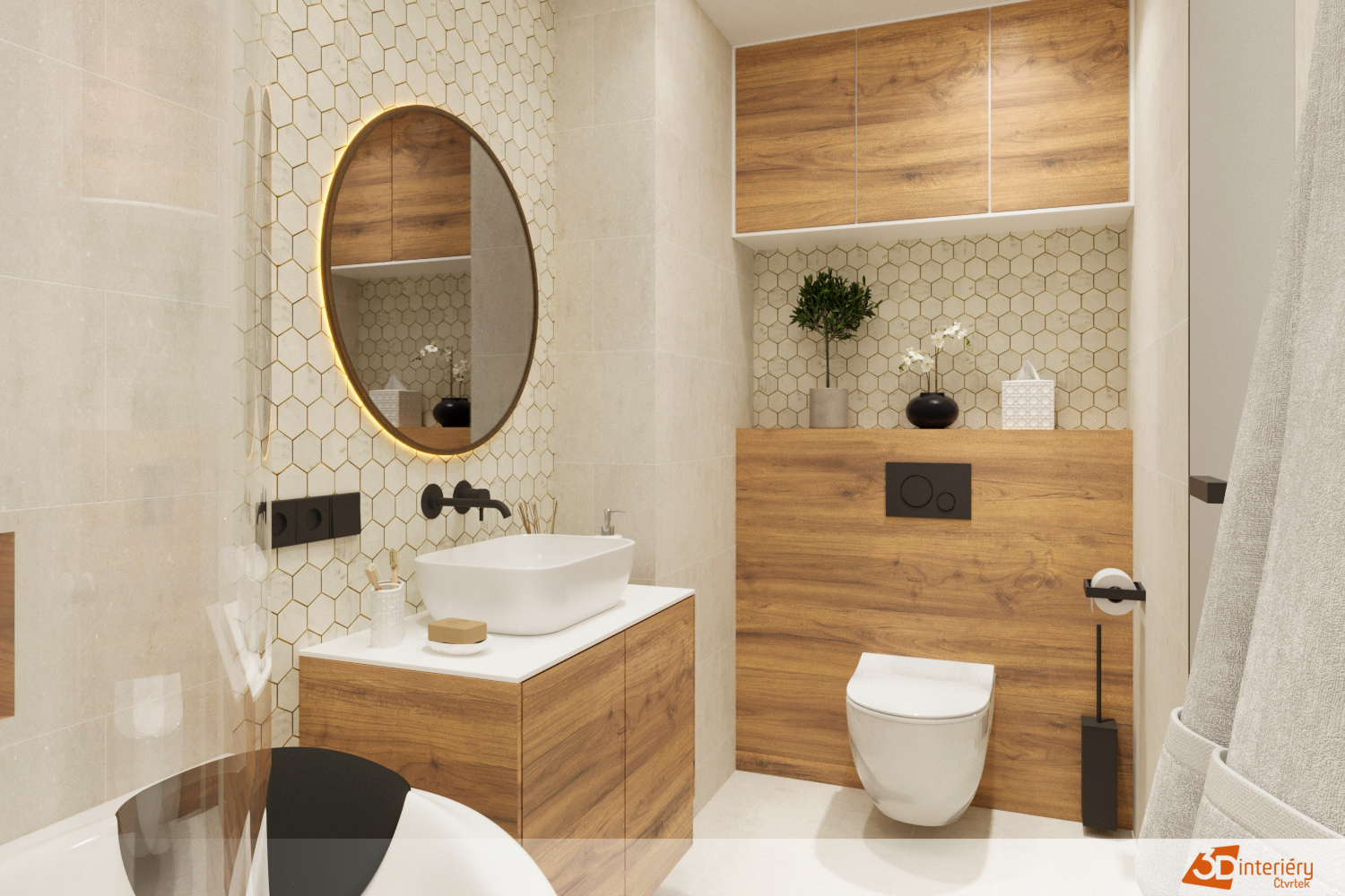 Osvětlení v podobě zlatých lamp nebo svítidel vytváří příjemnou atmosféru, která spojuje funkčnost s estetickým dojmem. K přírodnímu vzhledu přispívají také textilie, jako bambusové ručníky nebo koupelnové závěsy, které ladí s celkovým konceptem. Zelené rostliny v dekorativních květináčích mohou dodat svěžest a živost, čímž umocní přírodní charakter koupelny. Taková koupelna nabízí nejen funkční prostor, ale také místo pro relaxaci a odpočinek ve stylovém, přírodním prostředí.