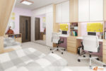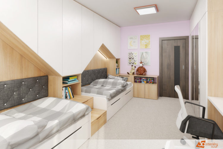 Našim úkolem bylo navrhnout interiér útulně a v přírodních barvách. Pokoj obsahuje dva pracovní prostory, dvě židle a postele s úložným prostorem. Jako materiál použili naši designéři lamino, nenáročné na údržbu a cenově nejdostupnější. Tvar skříní nad postelemi tvoří osvětlenou střechu, prostor tak působí prostorně a při čtení plní svou praktickou úlohu.