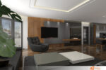 Rodinný dům a barvy – vše jsem tedy ladil do přírodních barev, kde především dominovala hnědá zemitá barva vyvážena antracitovou až černou barvou. Tu jsem použil především do róbusní kožené sedací soupravy, obložení stěn (v podobě mramoru) a závěsů. Tím vznikla vyváženost i harmonie mezi barvami, interiér tak získal na luxusu a moderním vzhledu aniž by působyl těžce.