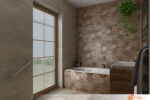 Co nám, ale v této koupelně hraje prim, je keramická dlažba z kolekce Clays od Marazzi. Na stěnách převládá velkoformátová kachle rozměr 120 x 60 cm v barvě cotton, na podlaze dlažba 60 x 60 cm v také v odstínu cotton. Návrh koupelny zvýrazněn o dominantní prvek obkladu za vanou ve formátu hexagonu v barvě earth. Celá kolekce je v matném provedení a propojení betonu a terracotty jí dodává punc nadčasovosti.