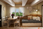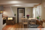 Nová krbová vložka ucelila krb vyrobený na míru z cihel v hnědé barvě. Vložka sloužípředevším k vytápění, ale i knavození příjemné atmosféry. Plynule navazují na varnou desku s troubou aintegrovaným odsavačem par. Veškerý nábytek v místnosti jsem navrhl z masivu. Kuchyňskou linku vyrobenou na míru. Dvířka nechal vyfrézovat a horní závěsné skříňky jsou členěné policemi. Stropní trámy, dřevěný strop a obložení venkovních stěn mají původní charakter i s kresbou dřeva. V celém domě došlo k sjednocení doplňků a vypínačů. V duchu tradic jsme vybrali osvětlení v mosazném provedení z kolekce Hallux https://www.hallux.cz/stropni-svitidla-plafon-4-svitidla-solar-5999.html nabízí závěsné, nástěnné i stropní varianty v různých velikostech. Cenu návrhu naleznete zde.