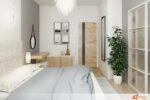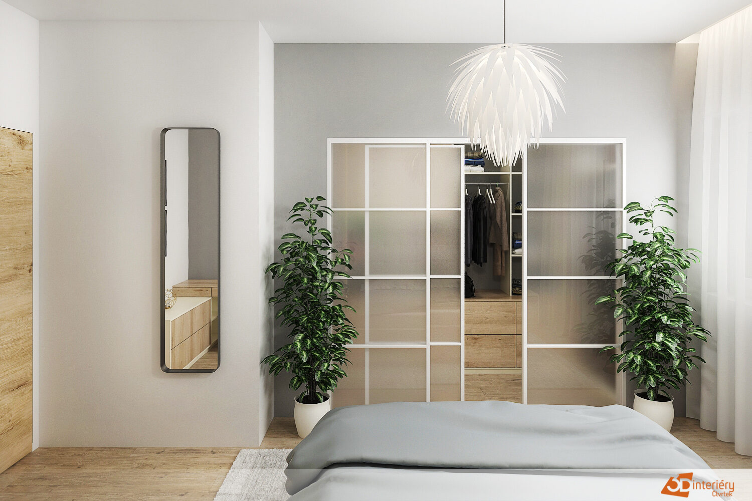 Pokud máte dostatek prostoru při projektování vašeho domu, rozhodně doporučujeme při něm myslet i na prostor pro šatnu. Ložnice s šatnou navrhl náš bytový designér Tomáš Jáger. Stylová, vkusná a příjemná, tato tři slova vystihují právě tento interiér, který od šatny odělují posuvné bílé interiérové dveře. Vzhledem k tomu, že v prostoru není potřeba počítat s prostorem pro šatní skříně, mohl designér věnovat tento prostor kosmetickému stolku a praktické komodě.
