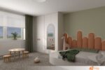 V každém dětském pokoji nesmí chybět kreativita a možnosti k hraní. Zde architektka použila ribstole jako palmu na kterou se dá vylézt a liánu na které se malá slečna bezpečně zhoupne.