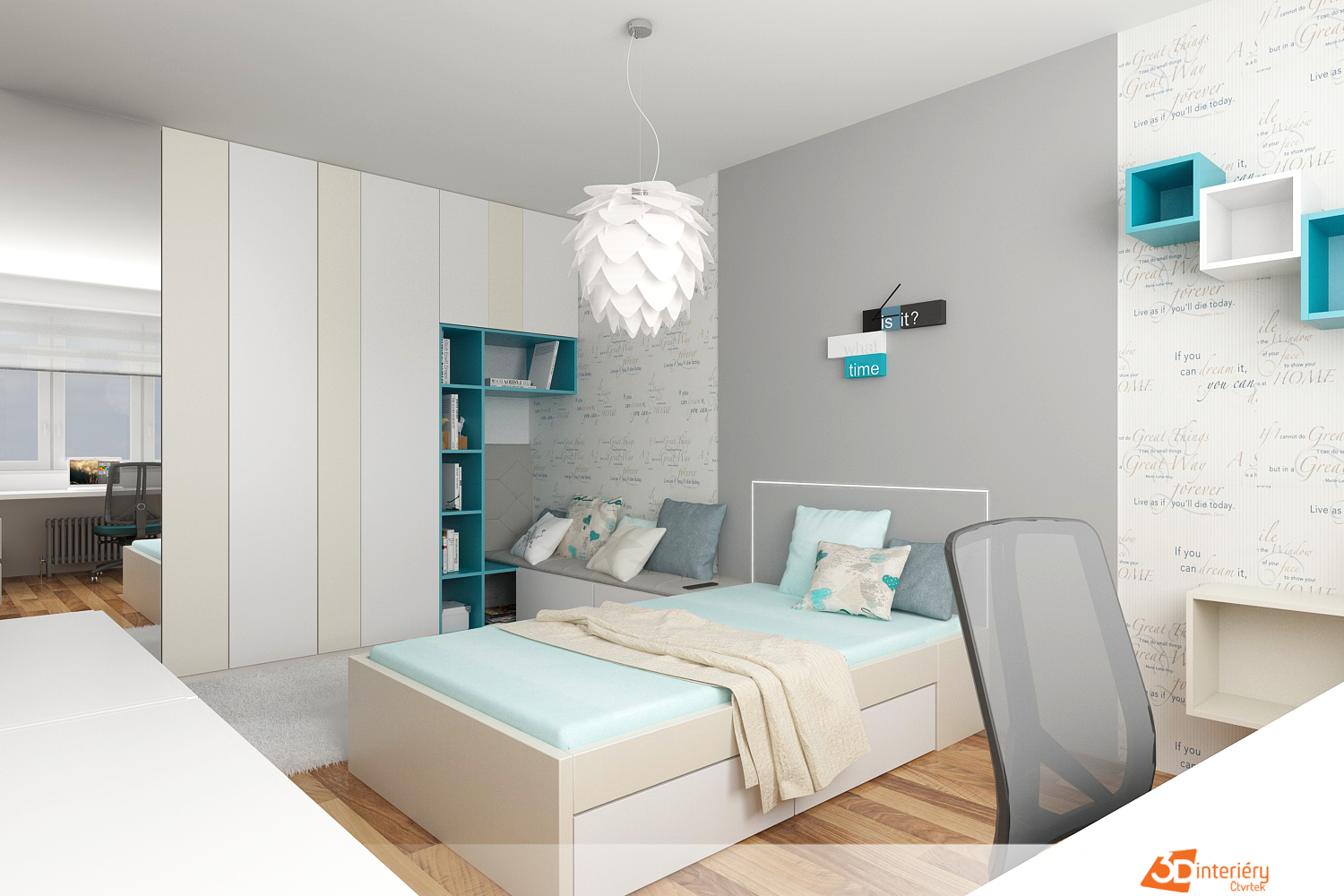 Návrh studentského pokoje pro 17ti letou slečnu… studentku Nikol. Pokoj pro studentku ve zlínském kraji jsem ladil do světlých přírodních barev oživených azurovou barvou. Barvy jsme vzhledem k stávající tmavé podlaze v bytě a k dveřím v barvě kalvádos, které byly na počátku drobnou překážkou, zvolili ve světlých bílých a béžových odstínech. Hlavním požadavkem studentky Nikol co se týče barev, byla azurová. Tato barva použitá jako doplňková a decentně umístěná na jednotlivé policové skříňky. Dekorace, jako polštáře, židli a čílka zásuvek jsem ladil rovněž do podobného odstínu.