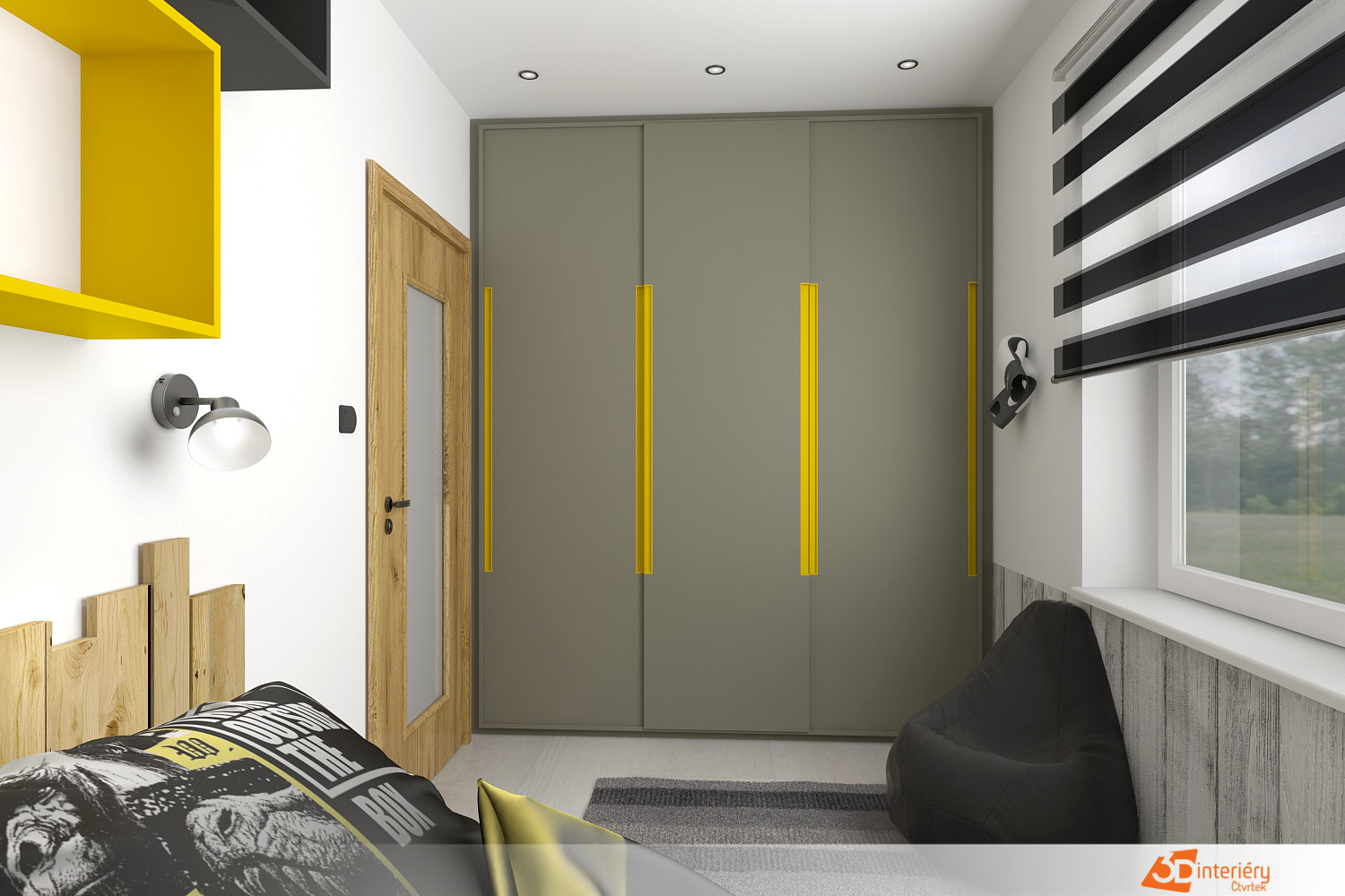 Interiér malého pokoje pro studenta vysoké školy řešil v rodinném domě v Milovicích kolega Jan Pokora. Návrh nevelké místnosti vždy působí jednoduše, opak je však pravdou. Vměstnat do malých prostor to co se běžně vejde do standartního rozměru, však nedělá problémy našemu kolegovi. I když tuto místnost vyžíval student pouze na oblečení a k přespání, nechal náš designér otevřenou variantu i pro budoucí umístění stolu pod parapet okna.