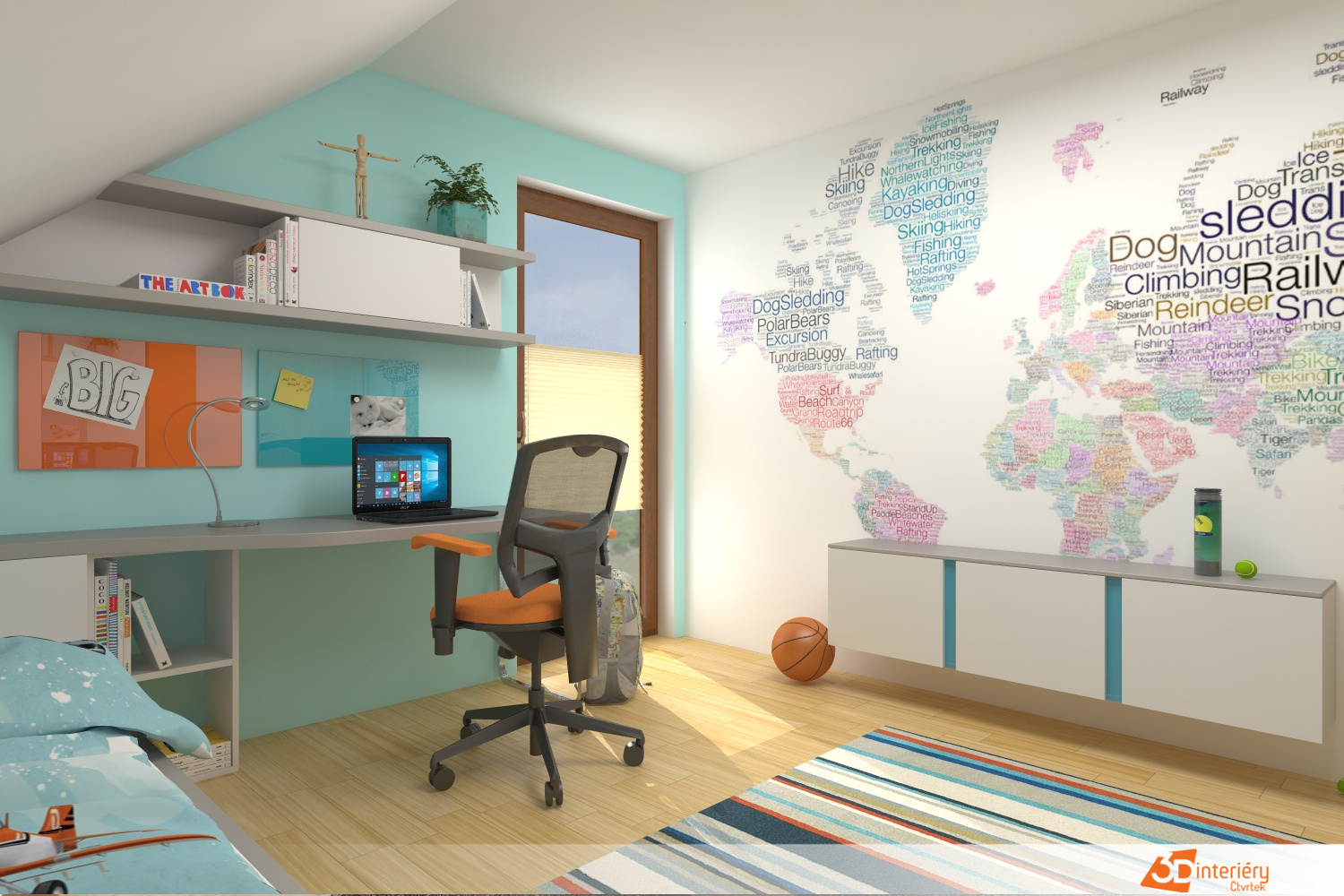 Pro atraktivní vzhled a zútulnění místnosti jsme použili teplou oranžovou v kombinaci studené modré. Dominantou v chlapeckém pokoji je fototapeta mapa světa. Přáním slečny ve studentském pokoji byla bordó tapeta za televizi. Dřevěné trámy a komínová šachta nám „rozdělily“ pokoj na zóny. Relaxační se širokou postelí, televizí, křeslem a užitkovou s pracovním stolem a vestavnou šatní skříní.