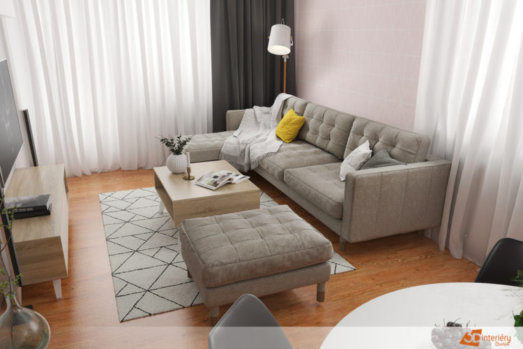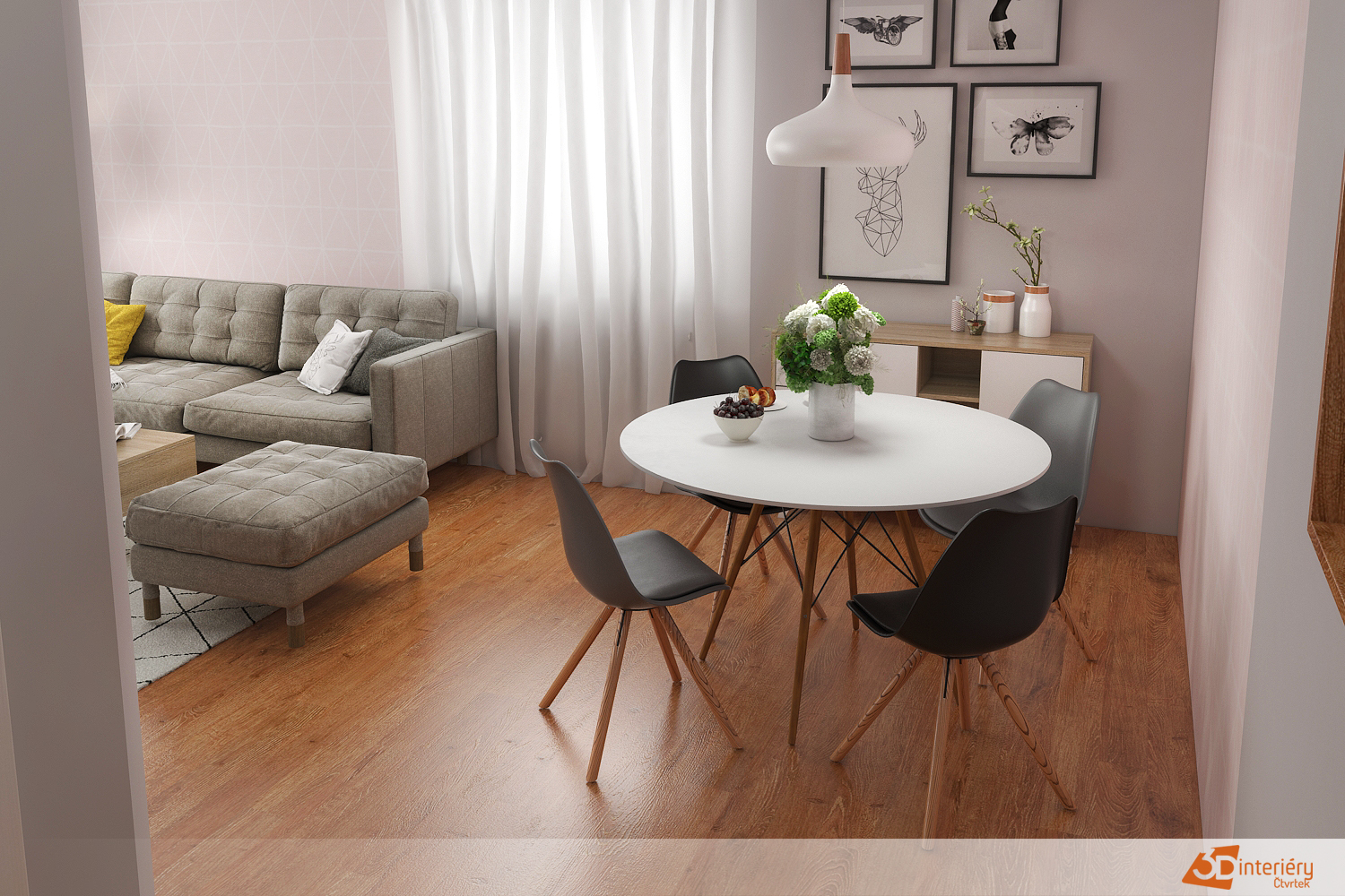 Tento moderní skandinávsky obývací pokoj se vyznačuje svou jednoduchostí. Splňuje všechna očekávání moderní rodiny. Je zde velká rohová sedačka, otoman, a dřevěno-bílý nábytek typický pro zvolený styl. Jednoduchostí se vyznačuje i jídelní kout s kulatým stolem a komodou sloužící jako příborník. Na stěnách se zde kombinuje světle šedá výmalba a tlumená geometrická tapeta.