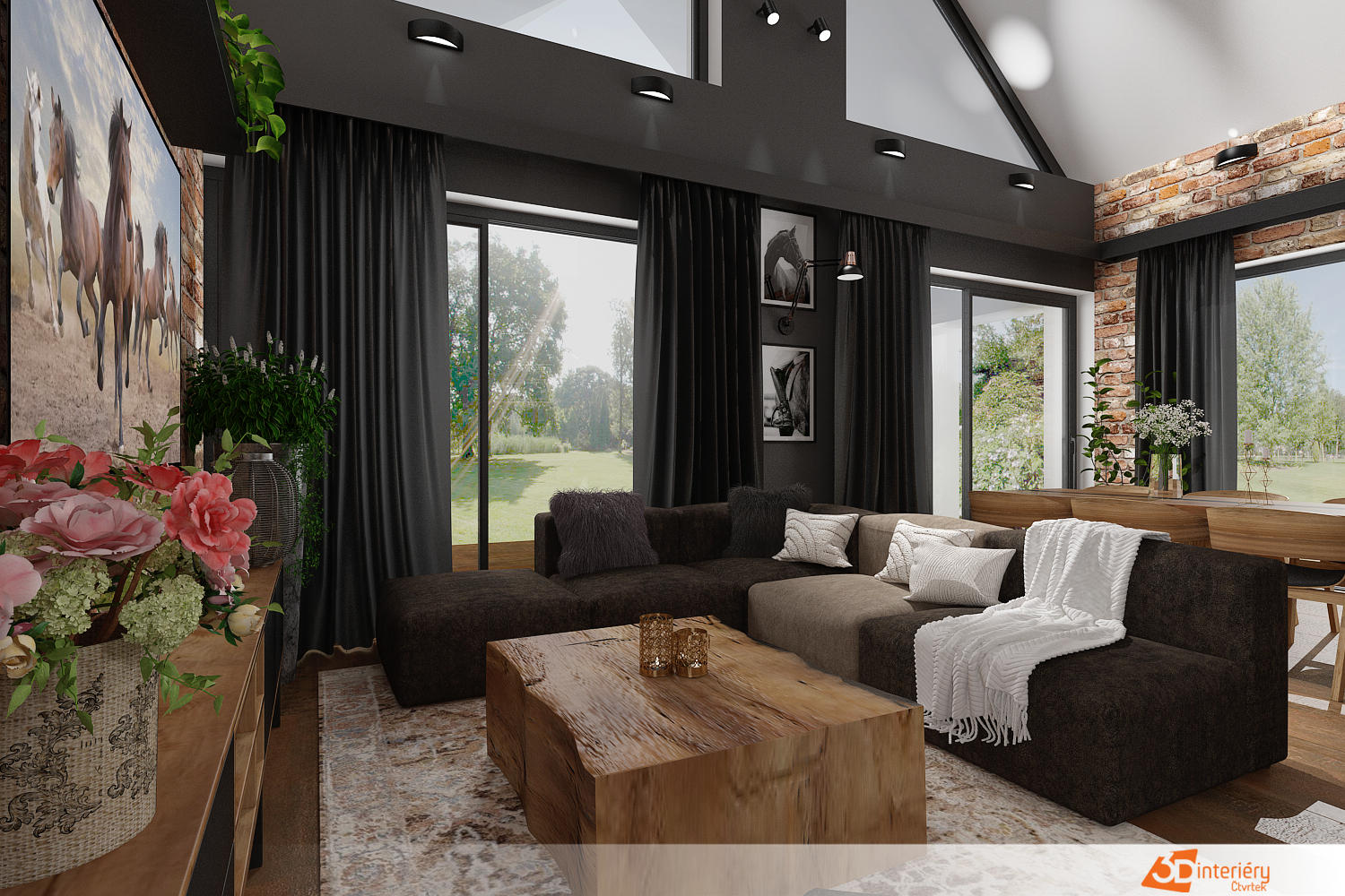 Vysočina novostavba – návrh nového rodinného domu mladého páru, který se opravdu nebojí tmavých odstínů. Interiér obýváku a kuchyně zpracovala interiérová designérka Eva Schneider. 3D vizualizace ukazuje několik druhů osvětlení, umístění trámů, dispozicí ostrůvku, rozmístění prvků kuchyně atd. Vše uvidíte před realizací v reálné podobě a můžete se rozhodnout před investicí do realizace tak, aby bylo vše dle Vašich požadavků a představ.