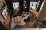Obývací pokoj s tmavými prvky nabízí elegantní a sofistikovaný vzhled. Dominantní barvy – tmavé odstíny hnědé, šedé a černé – dodávají prostoru hloubku a intimitu. Místnost se vyznačuje moderním nábytkem, kde tmavé dřevěné stoly a skříňky kontrastují s jemnými detaily v kovu. Pohovka s tmavým čalouněním zútulňuje prostor a vybízí k odpočinku. V kombinaci s měkkými textiliemi, jako jsou sametové polštáře nebo závěsy, vzniká příjemné a pohodlné prostředí.