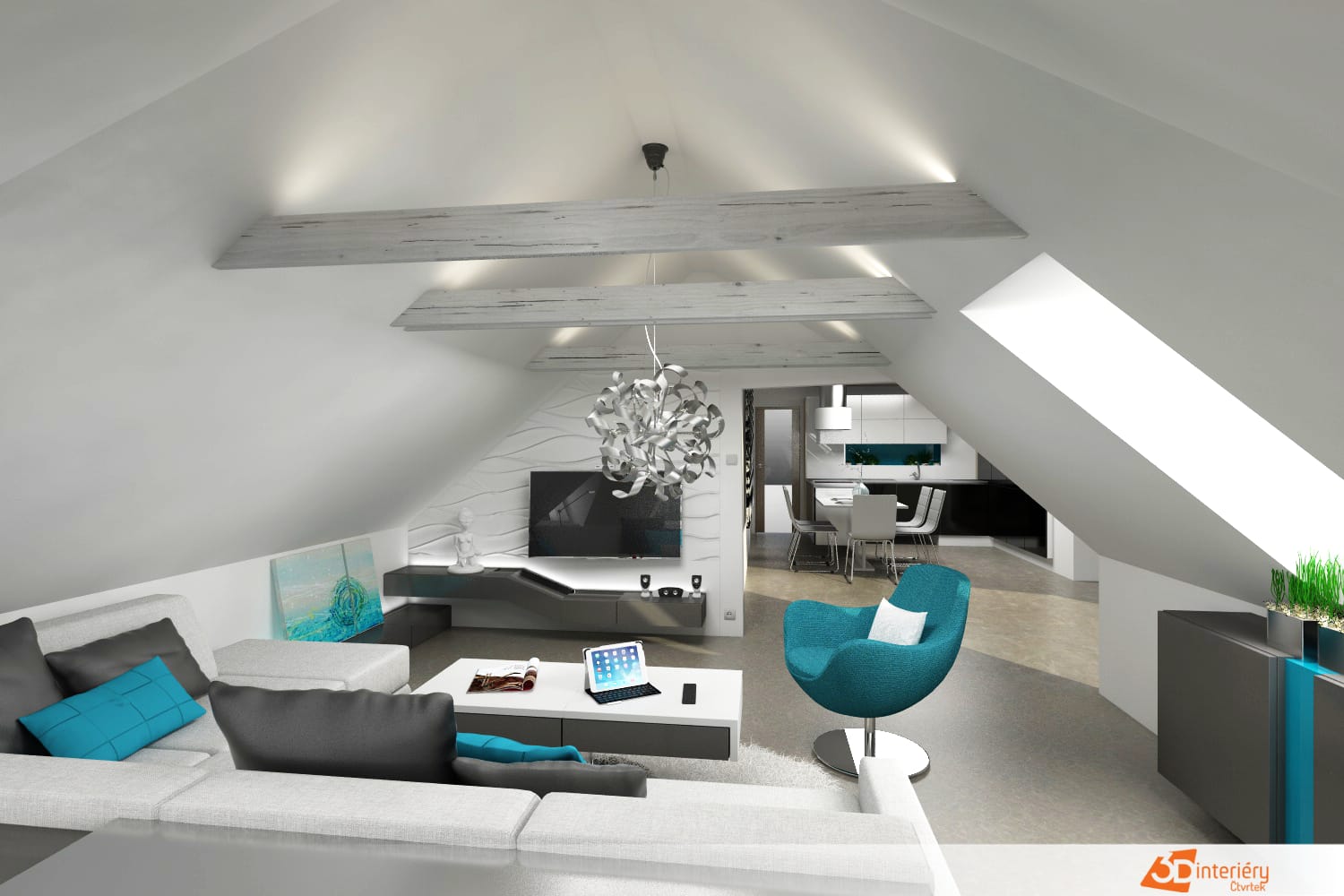 V návrhu interiéru podkroví jsme použili azurovou barvu pro zklidnění interiéru