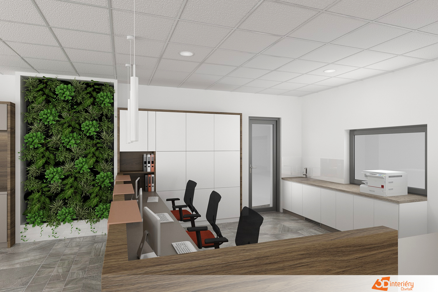 Nábytek jsme volili kombinaci lamina dekor dřeva a uni dekor, u recepčního pultu jsme pracovali také se sklem. Minimalistická kuchyňka se v případě potřeby skryje za posuvné dveře do nábytku. V druhé variantě je návrh doplněný o vertikální květinovou stěnu. Jedná se o designový prvek vhodný do moderního interiéru. Realizaci těchto květinových stěn pro nás zajišťuje firma Jungle Interiors.
