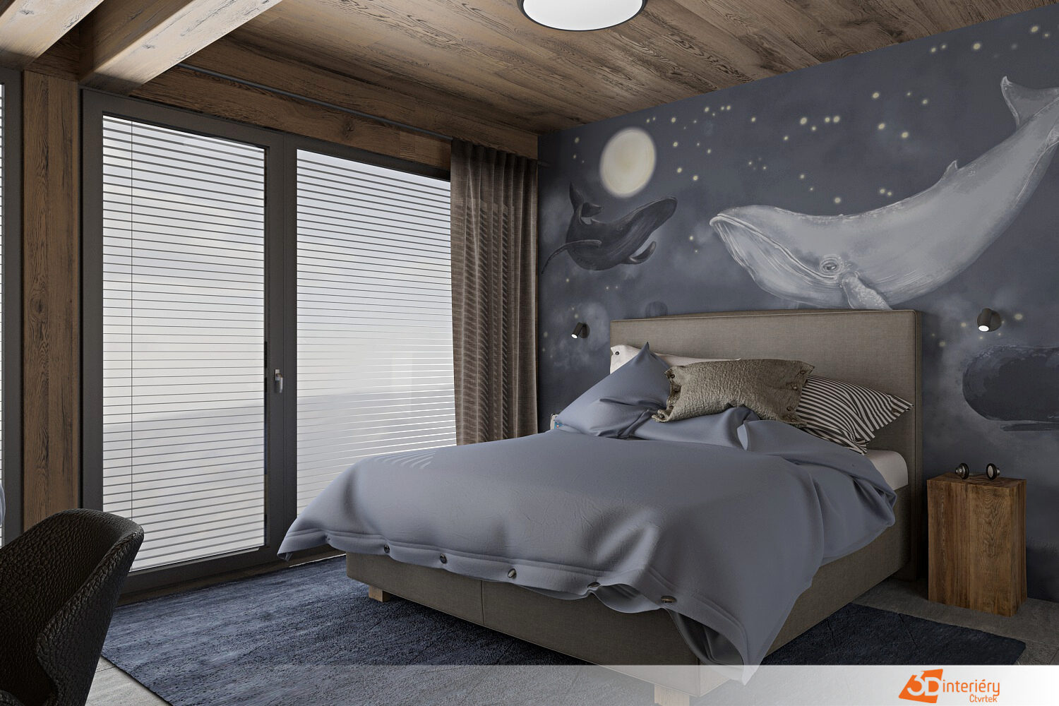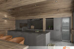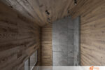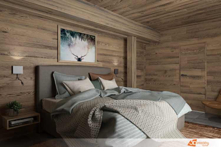 Interiér horské chaty – horský chalet v alpském stylu se nachází v romantickém prostředí zalesněné krajiny. Majitelům poskytuje překrásný výhled do údolí. Dům navržen tak, aby co nejvíce korespondoval s okolní přírodou. Exteriér domu se skládá z kamenné podezdívky ve spodní části budovy a dřevěného obkladu celého horního patra po střechu. Touto myšlenkou pokračujeme i v interiéru. Stěny a stopy zaklopené opalovaným, mořeným smrkovým prknem. Centrální stěna schodiště, tělo krbu a část relaxační místnosti, obložené štípaným kamenem v teplých měděných odstínech.