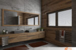 V celém domě jsem navrhla keramické, jemně reliéfní, velkoformátové, tmavě šedé dlažby série Quarzit od Raka. Stejný obklad jsme použili v koupelnách a relaxační místnosti navazující na finskou saunu. Té dominuje velkoplošná prosklená stěna s výhledem do krajiny. Chata by měla sloužit majitelům jako místo k odpočinku a uvolnění, proto i všechny ložnice v domě jsou vybaveny kvalitními čalouněnými postelemi od značky Hästens.