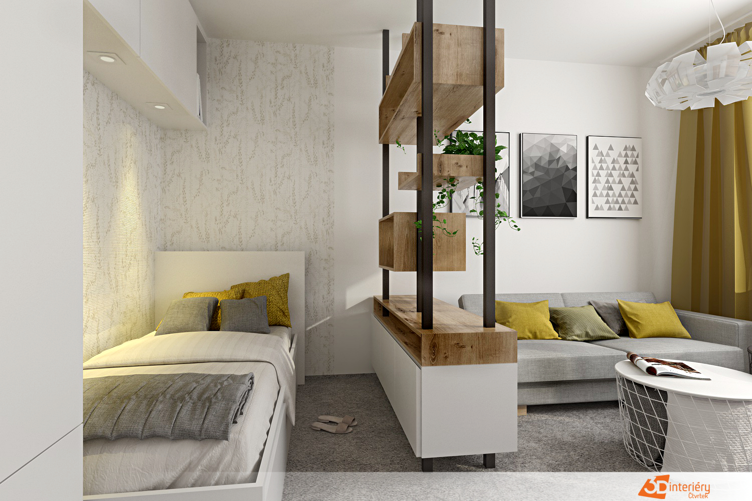Obývací pokoj, který slouží především i jako ložnice, požadovala zákaznice oddělit. Nejlepší varianta jak oddělit prostor na spaní – úložný prostor. Tento prostor bude zároveň hlavním designovým prvkem místnosti. Sedací souprava i konferenční stolek zakoupili zákazníci v Ikea, což bylo přání zákaznice. Ostatní nábytek truhláři vyrobili na míru. A to z důvodu maximálního využití úložného prostoru…… kterého není nikdy dostatek.