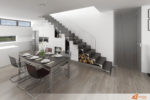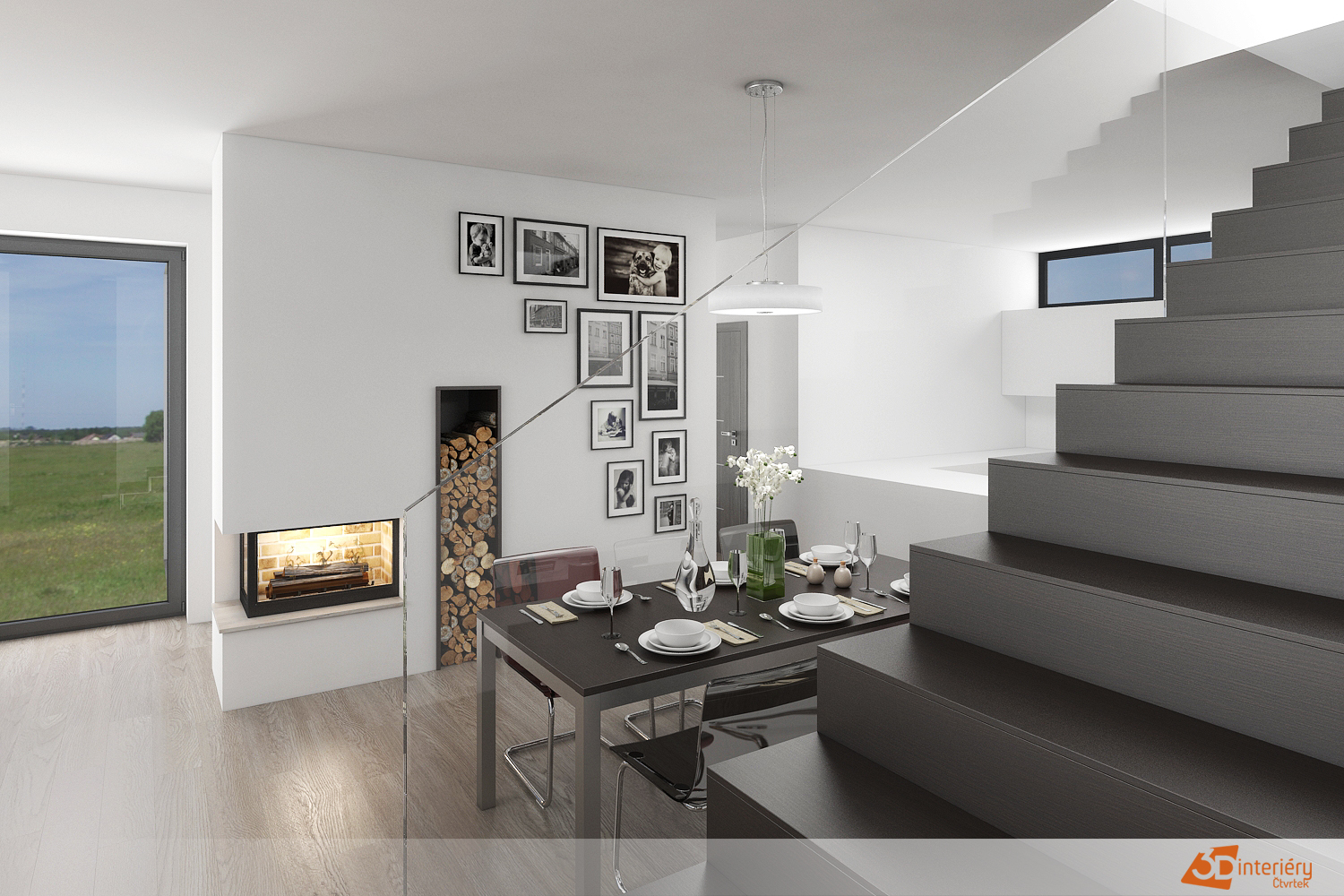 Moderní dům si zaslouží moderní interiér. Při vstupu do prostoru Vás přivítá velká sedačka do U pro 7-8 osob. Navíc lze prostor doplnit o taburety. Konferenční stolek a TV stěna jsou řešeny minimalisticky jelikož je v domě dostatek úložného prostoru. Nad sedačkou je podhled z laminované desky, který je podsvícený LED páskem s nastavitelnou intenzitou světla. Pro trochu kontrastu se na stěnách použil obklad z přírodního kamene.