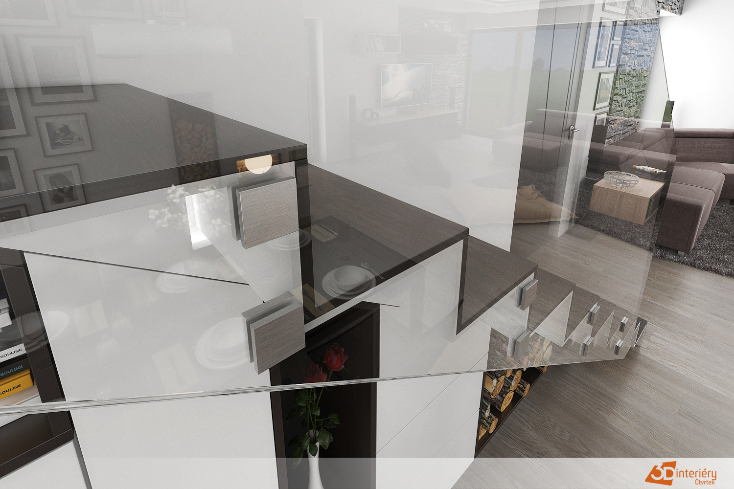 Dominantou kuchyňské části jsou bílé ocelové schody s laminátovou nášlapnou plochou a skleněným zábradlím. Stávající kuchyňská linka se rozšířila o kuchyňskou stěnu s americkou lednicí a vyvýšenými spotřebiči. Do kuchyňské stěny se pro zajímavost zakomponovalo pár otevřených polic na dekorace. Stěna pak nepůsobí sterilně.