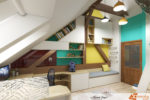 Stávájících 6 trámů na stěně naproti palandy propleteny skříňkami, otevřenými i uzavřenými pro dostatek úložného prostoru. Čímž vznikl dostatečně velký úložný prostor, kterého není nikdy ve studentském pokoji dostatek. Na stěny architekt rozmístil různé barvy, které si vybrali děti sami a i tímto barevným trikem pokoj nabral na hravosti a zajímavosti.