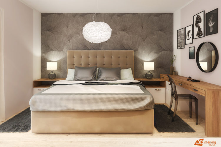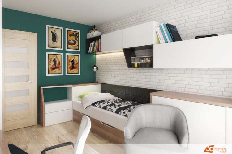 Ložnice je podobně jako i hlavní obytný prostor v Modřicích jsem navrhl v tlumených přírodních odstínech což jsou vhodné barvy, které přispívají ke klidnému rodinnému životu. Dominantou prostoru je velká kontinentální postel s čalouněným čelem a vestavná skříň kombinovaní s posuvnými dvířky, šuplíky a nikou pro menší TV. V dětských pokojích se kladl důraz na praktičnost a efektivní využití prostoru. Samozřejmostí jsou širší postele, hodně úložného prostoru, šatní skříně a psací stoly.
