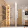 Hlavní koupelna v domě má dost prostoru na velkou vanou i prostorný sprchový kout s podsvícenými policemi v nice. Také zde najdete skříň na schování pračky a sušičky a umyvadlovou skříňku na míru.